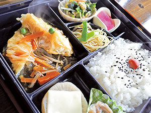 肉・魚のタンパク質、季節に合わせた食材、地元で生産されている食材等もと入り入れた日替わり弁当です。その他、会議用弁当やオードブルのご注文も承っています。