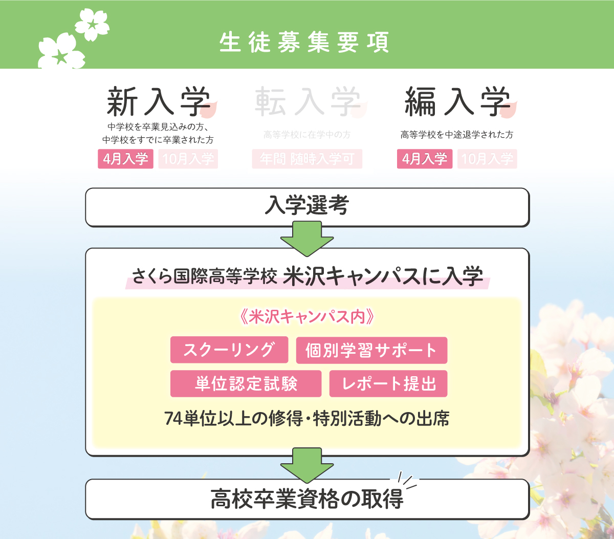 そこで、中学校から高校進学において進路で迷っている生徒の方々にもう一つの進路の選択肢として、心身ともに安心して、自分らしく学習ができる環境が必要と考え、地域密着型のサポート校として通信制高等学校「さくら国際高等学校 米沢キャンパス」を開校する運びとなりました。